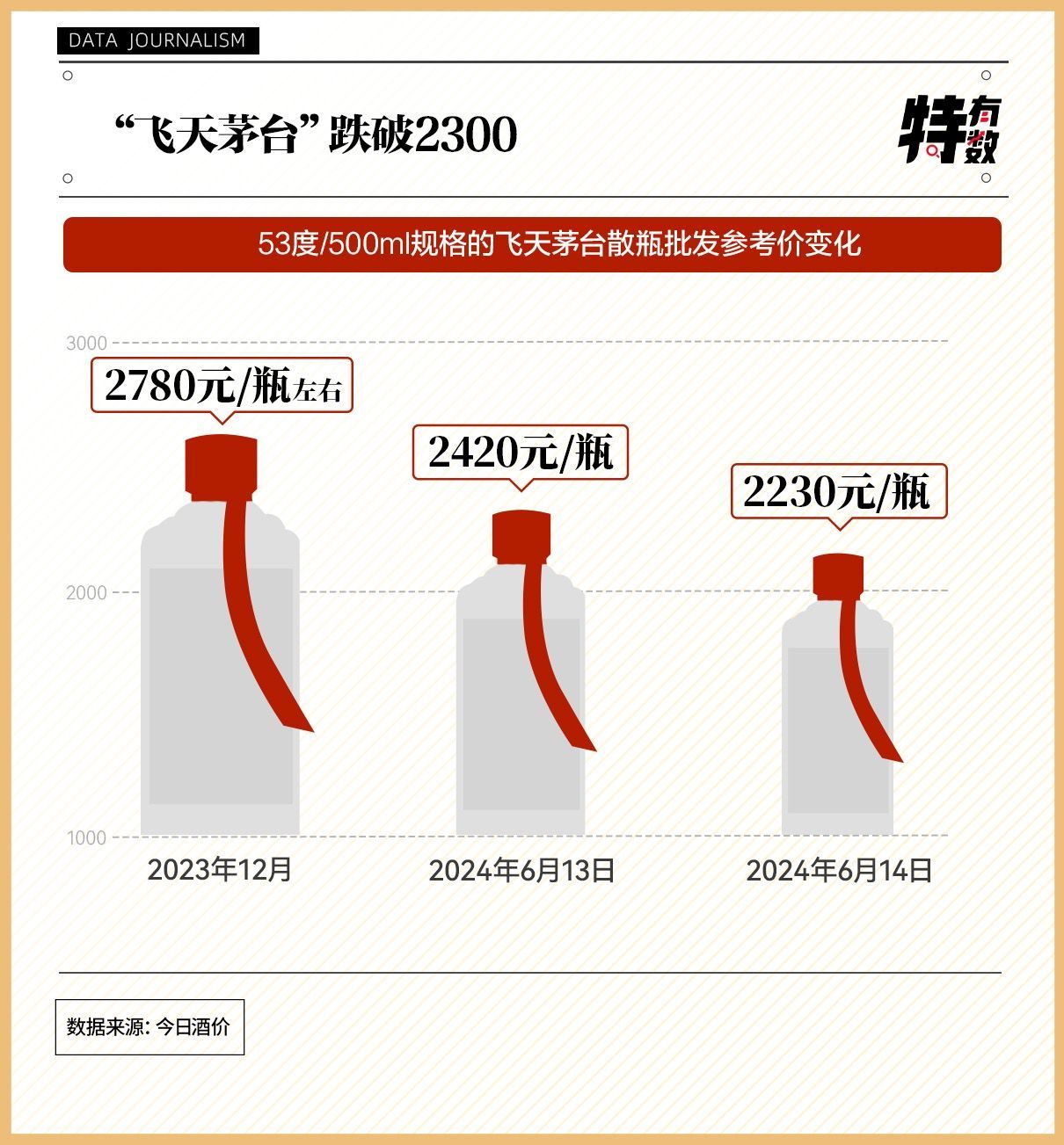 字据关联数据,6月14日,飞天茅台散瓶批发参考价跌至2230元/瓶;而在前一日,即6月13日,飞天茅台如故2420元/瓶,单日跌近两百元。2023年12月,53度/500ml规格的飞天茅台散瓶批发参考价在2780元/瓶足下。