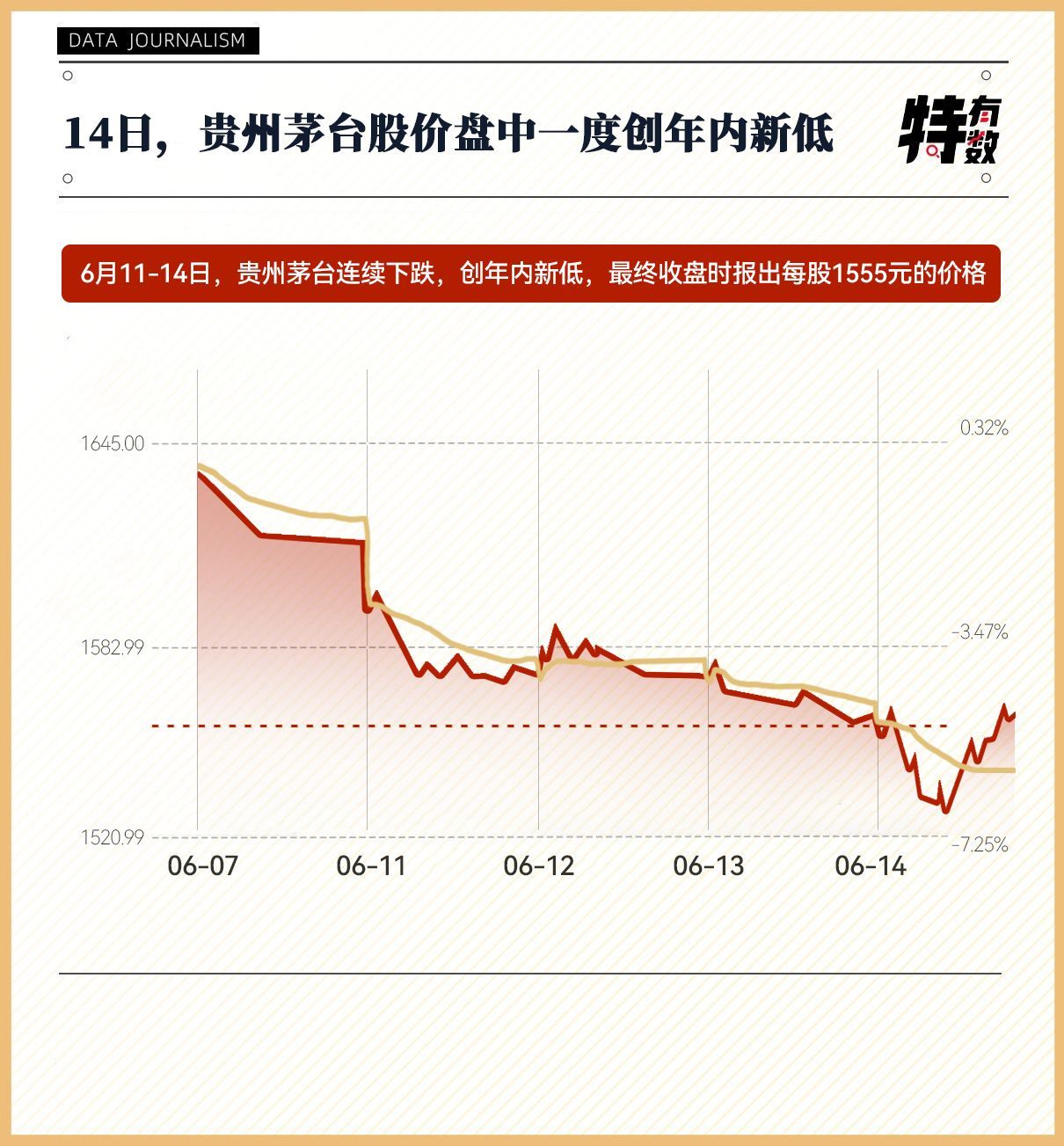 在飞天茅台这一中枢居品的批发参考价出现下滑的布景下,贵州茅台的股票价钱情况怎样?自5月份以来,贵州茅台的股价照旧累计下落跳动10%。到了6月14日,贵州茅台的股价盘中一度波及了本年的最低点,最终收盘时报出每股1555元的价钱。