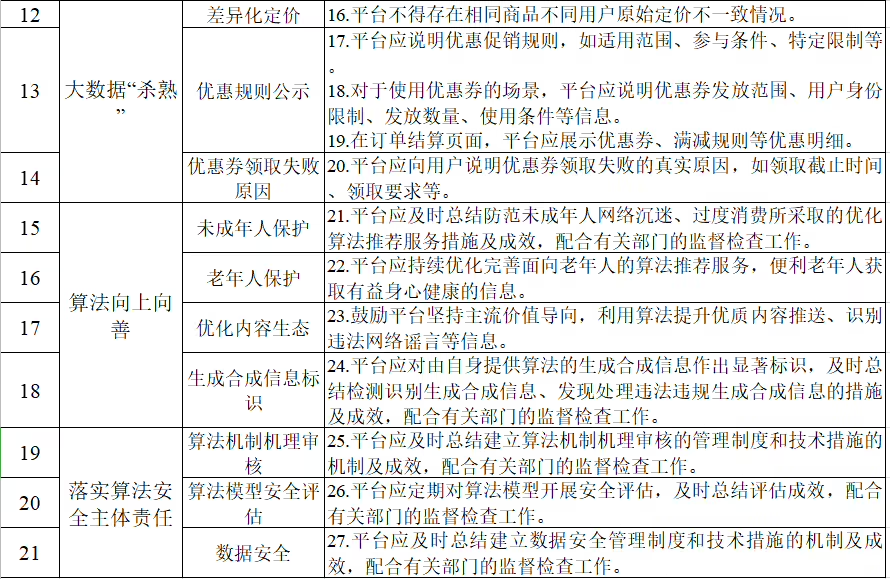 1.算法导向正确。健全完善正能量优质试验池,优化算法推选服务机制,积极传播正能量,促进算法应用朝上向善;建立健全用于识别违警和不良信息的特征库,积极探索应用于识别违警和不良信息的算法、时期,防御和遏抑传播不良信息。不得确立开辟用户千里迷、过度糜费等的算法模子。不得利用算法搅扰信息呈现,实行影响采集公论有时消亡监督料理活动。
