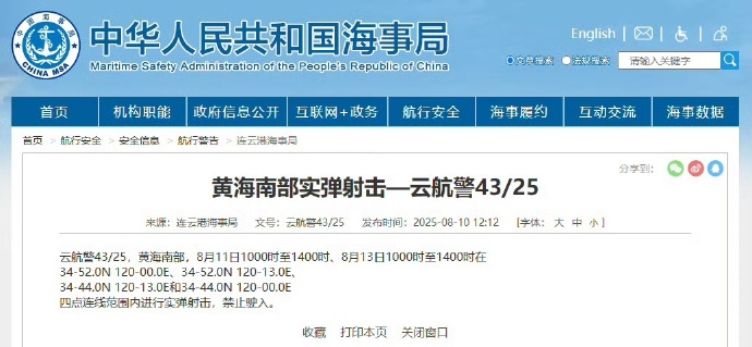据中国海事局网站音讯,连云港海事局发布飞行教养,8月11日10时至14时、8月13日10时至14时现金万博manbext体育官网app平台,黄海南部部分海域进行实弹射击,阻截驶入。